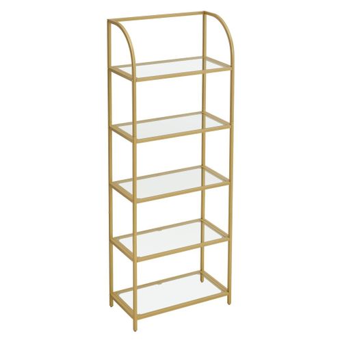 Regał wykonany ze szkła i stali malowanej proszkowo na kolor złoty. Produkt tworzy niesamowitą dekorację Twojego pomieszczenia. Półki regału są stabilne, a więc możemy umieścić na nich książki, kwiaty w wazonach, ozdobne figurki, dziecięce zabawki oraz ramki ze zdjęciami.